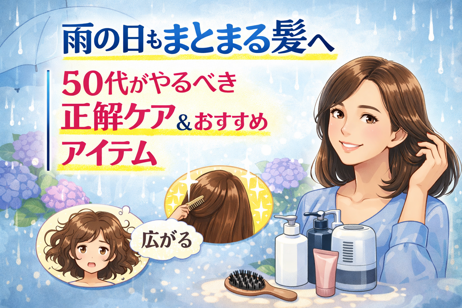 梅雨の季節、外に出た瞬間にボワッと広がる髪——50代の女性なら、この悩みを一度は経験したことがあるのではないでしょうか。雨の日の広がりやうねりは「手入れ不足」ではなく、髪の構造と湿気の関係が原因です。50代になると髪のキューティクルが整いにくくなり、外部の湿気を吸収しやすい状態に。だからこそ、正しいケアとアイテム選びがとても重要になります。