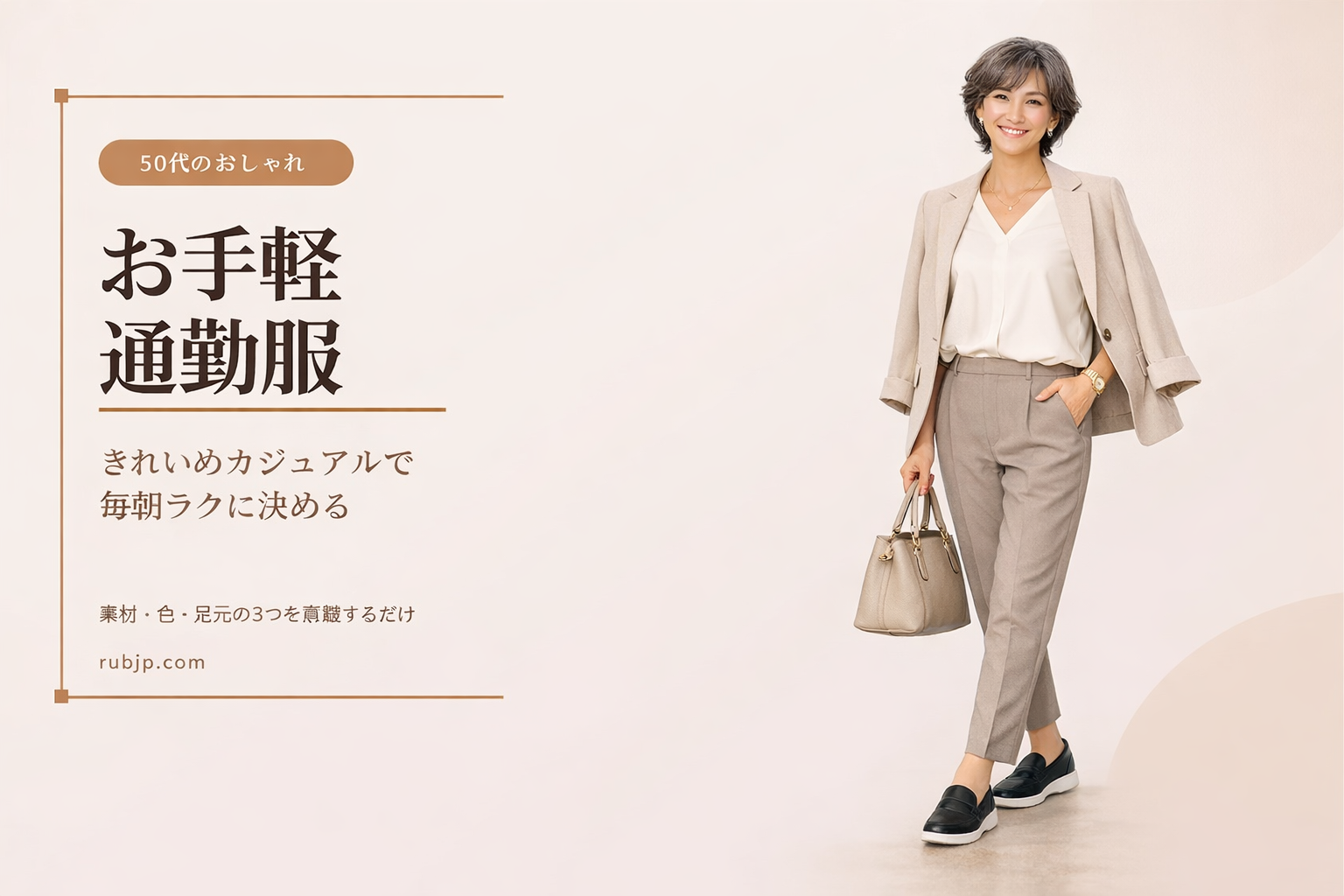 きれいめカジュアルのポイントは、「素材」「色数」「足元」の3つだけ。この3つを意識するだけで、50代の通勤スタイルは見違えるほど変わります。まずはクローゼットの中から使えるアイテムを見直してみてください。